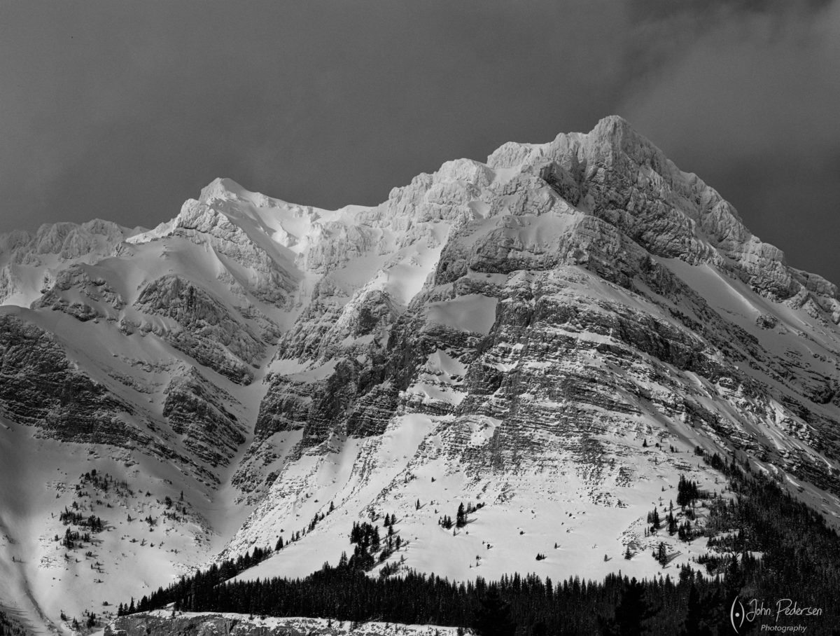 We heading to Morants Curve, even though the weather wasn’t forecast to be any good.  After sitting there for 30 minutes, we headed south along the road and right when we got to another pullout, the clouds parted and we could see the mountains across the Bow Valley.  We quickly pulled in and got our gear out.  We spent a good 45 minutes there photographing from several vantage points.  The train tracks, that are famous at Morants, also run along this stretch and we could get a “quasi”-Morants type of shot.