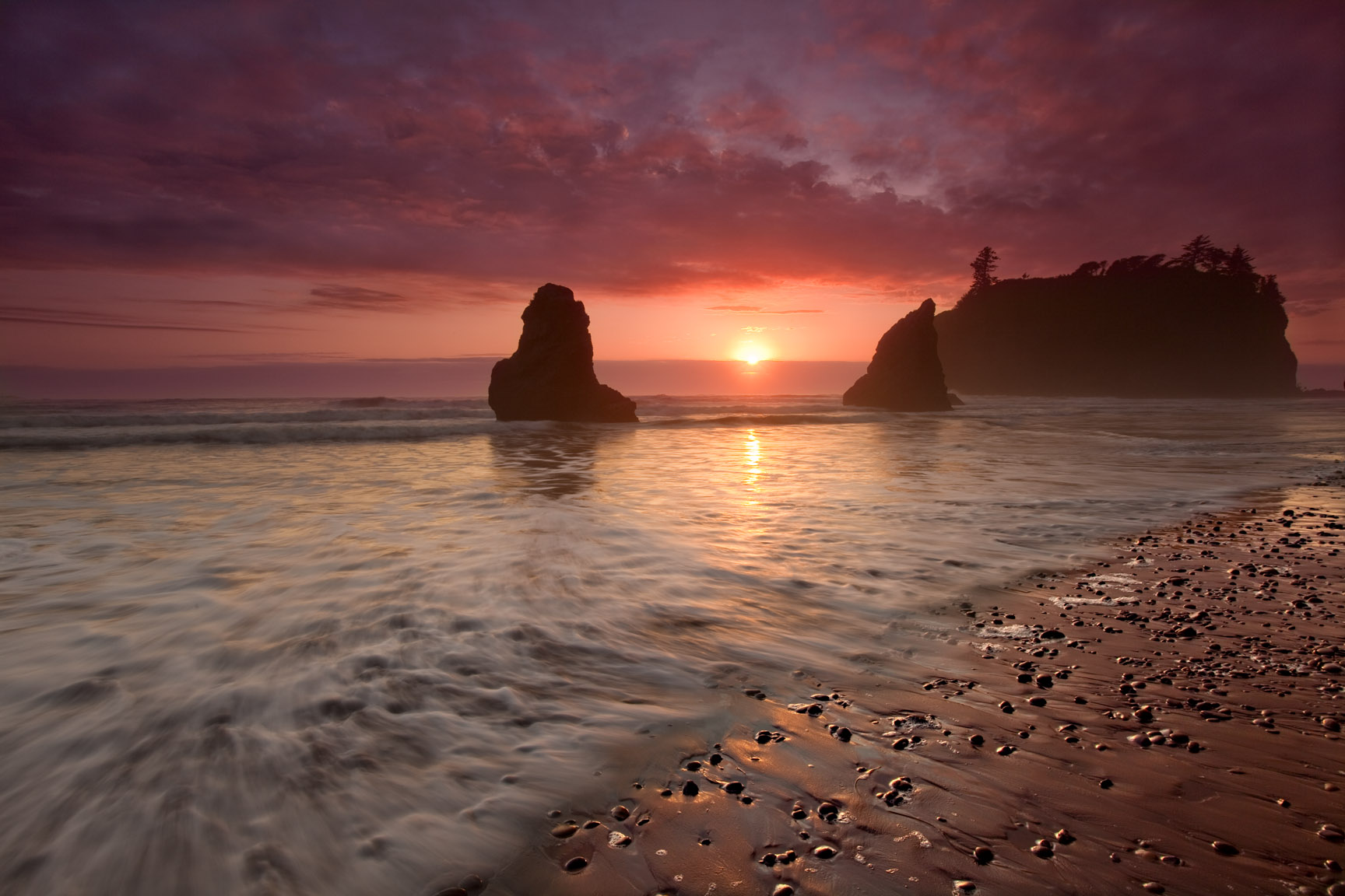 Rain and storms on the northern Washington coastline are common this time of year. Yes, we shoot in the rain, but if you want drama, this is for you! This is a great time to be here since the rainy season makes for great sunsets and light. Typically, the best photography here is made in the soft light of a rainy day as we move about the park. The advantage of making images in the rain is that when most objects are wet they glisten and the water bends the reflected light coming off an object’s surface. The water reflects the light in various directions which intensifies and enhances the already special effect of the deep green lush rainforests that we’ll be experiencing.