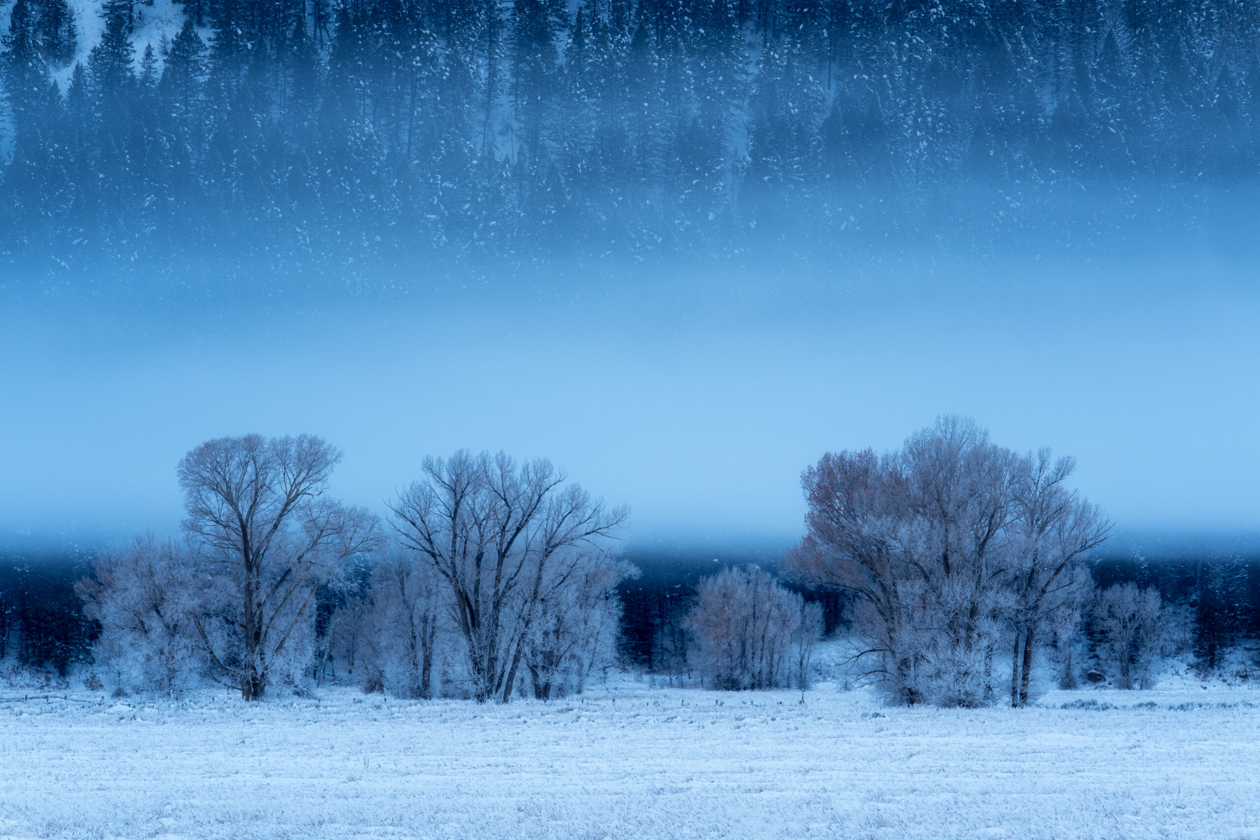 And the last example of this is when the fog or mist does something really cool, like the below shot from Grand Teton National Park in Winter. We were shooting the mountains at sunrise and I happened to turn around and look at the meadow behind us off in the distance and saw this cool behavior in the fog.